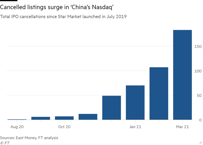 2019年7月に開始した上海の新証券取引所スターマーケットが発表した数字によると、76社が3月にIPO申請をキャンセルした(Financial Timesの分析による)。